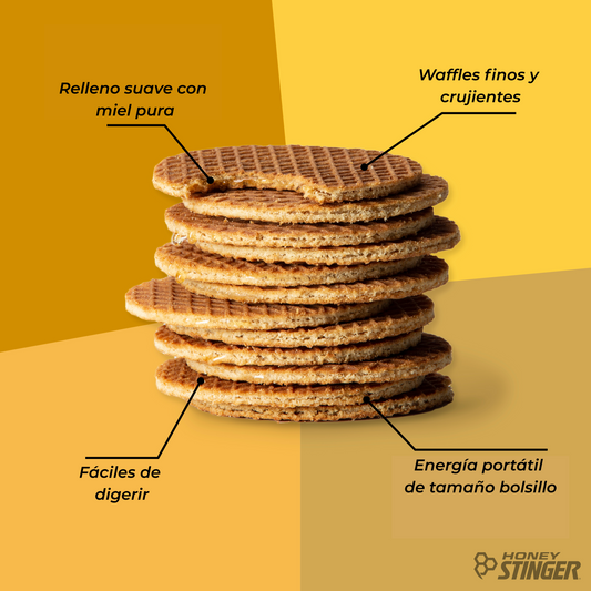 Disfruta un 40% de descuento en nuestros waffles energéticos con miel natural, elaborados con ingredientes premium. Los waffles Honey Stinger son obleas finas rellenas de miel, ideales para consumir antes, durante o después de entrenar. Son deliciosos, livianos y aportan energía rápida gracias a sus carbohidratos fácilmente digeribles, ayudándote a mantener el rendimiento en cada desafío deportivo.